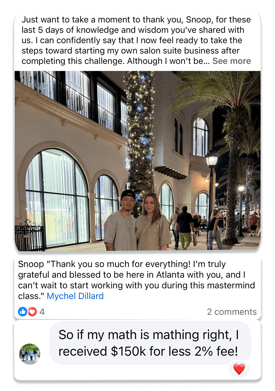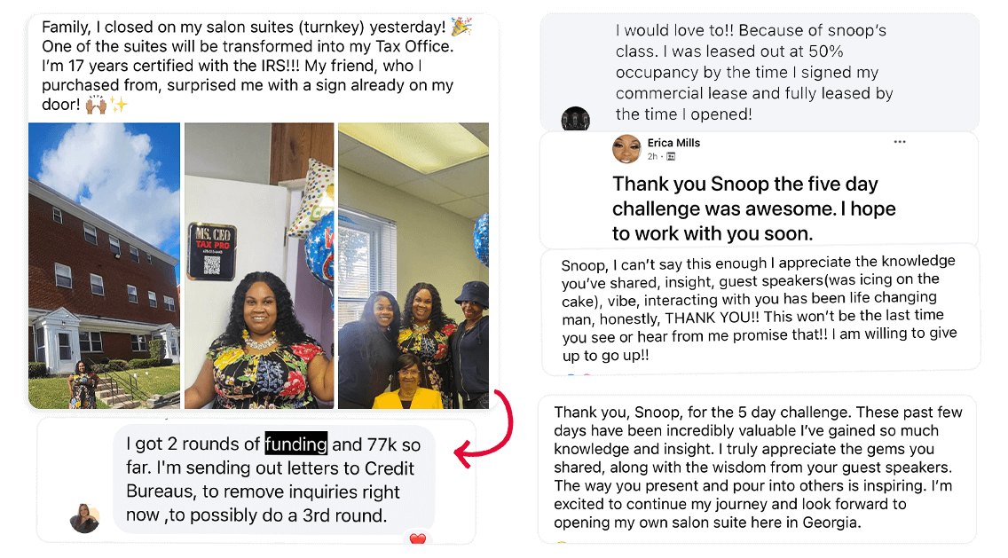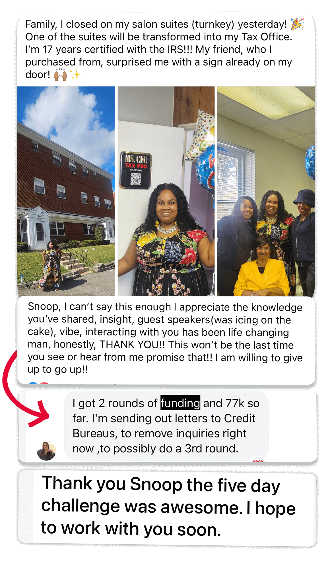 Immediate access to the challenge prep materials, Snoop’s private support group, all live sessions, and exclusive bonus trainings on tax hacks and grants.